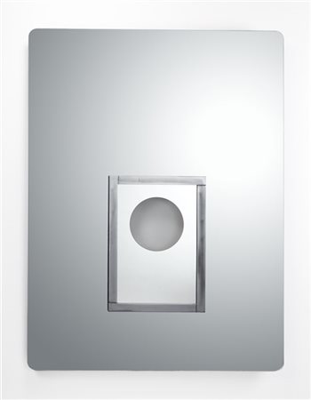 Pannello a specchio disegnato per coprire il vano porta estintori sulla base della serie "Fasce Cromate". Produzione Azucena, Milano, metà anni '80. (cm 120x159)