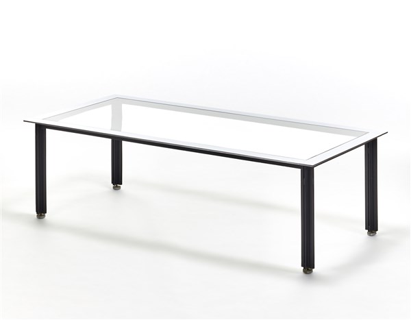 Tavolo da salotto della serie "T10 Fasce Cromate". Produzione Azucena, Milano, 1957. Struttura in metallo laccato nero, piedini cromati, piano in cristallo con perimetro in metallo cromato. (cm 150x45x70) (difetti)
