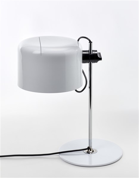 Lampada da tavolo della serie "Coupé". Produzione O-Luce, Milano, disegno del 1967, esemplare degli anni '90. Fusto in metallo cromato, riflettore e base in metallo laccato bianco. Recante etichetta del produttore. (h cm 42) (lievi difetti)