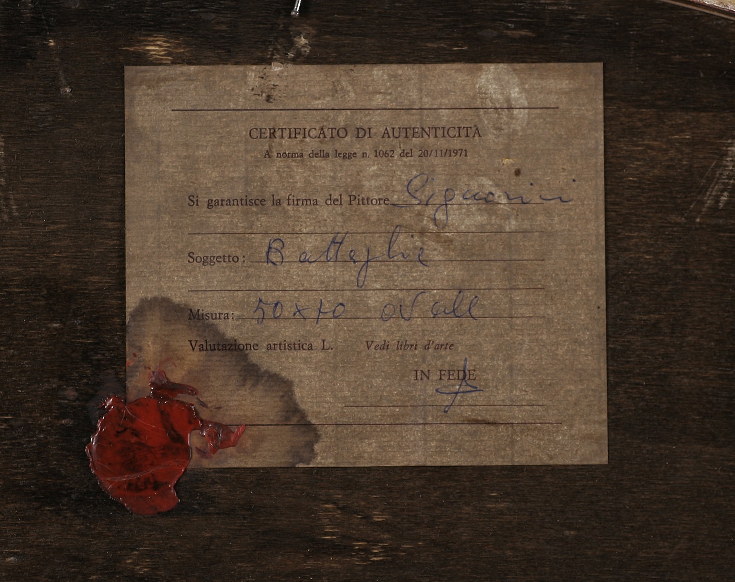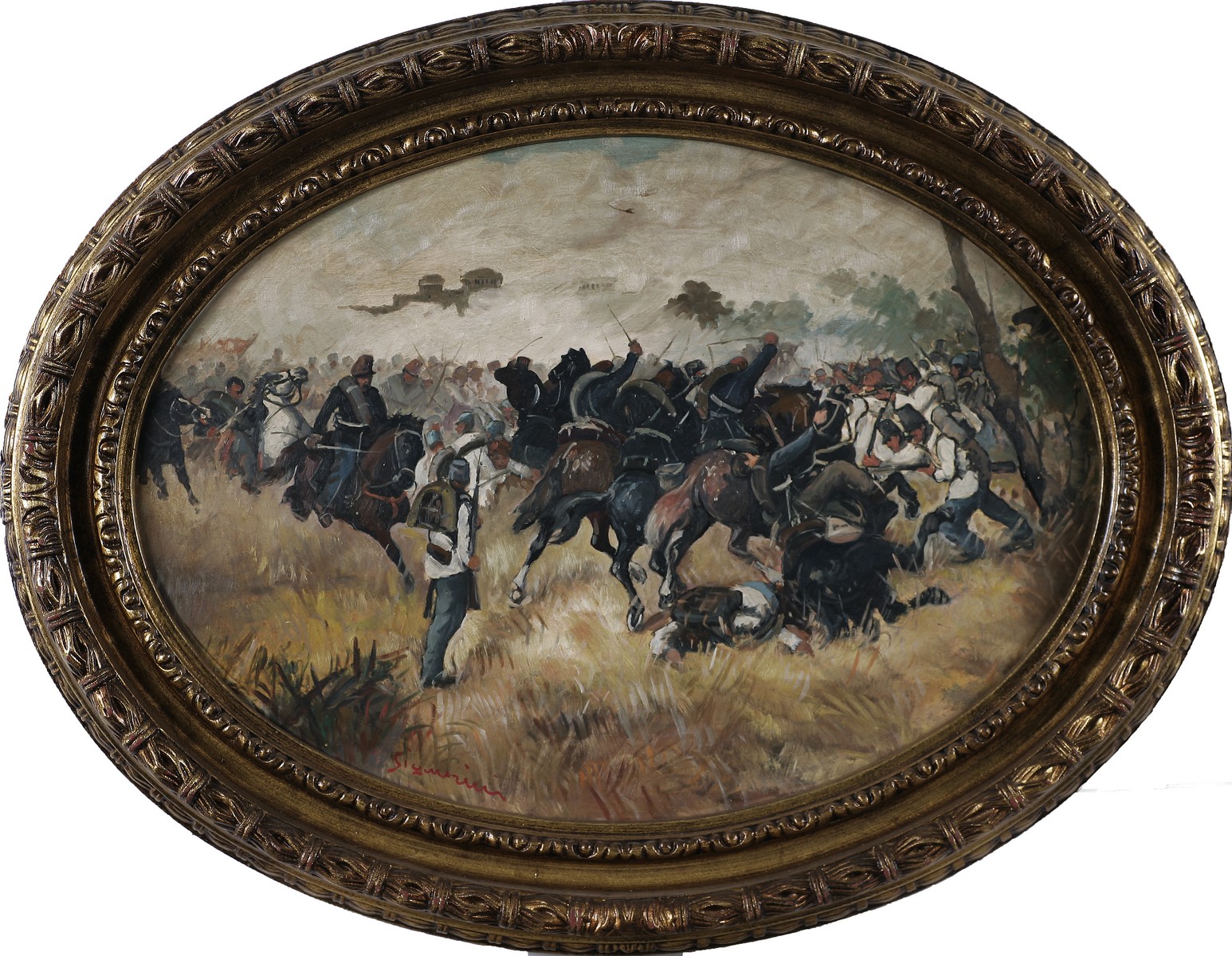 SIGNORINI TRISTANO Battaglia. Olio su tavola. Cm 70,00 x 50,00. Ovale. Firma in basso a sinistra. Al retro certificato di autenticità dell'opera. Cornice presente