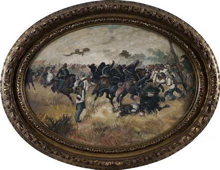 SIGNORINI TRISTANO Battaglia. Olio su tavola. Cm 70,00 x 50,00. Ovale. Firma...