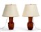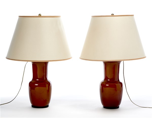 Pair of lamp-mounted baluster vases of the series "Opalini". Murano, 1970s. Pagliesco incamiciato glass mounted as a lamp, fabric lampshades. Signed under the base "Venini Italia". (h 68 cm.) (slight defects)