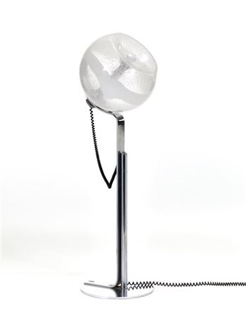 Lampada da terra con struttura in acciaio, diffusore sferico in vetro trasparente incolore e lattimo con inclusione di bolle irregolari. Italia, anni '70. (h cm 136) (lievi difetti)