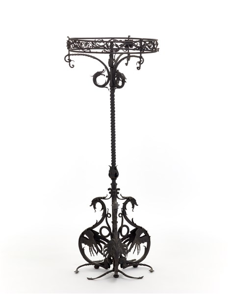Lampada da terra a tripode in ferro battuto, con a volute a motivi vegetali e base in foggia di tre dragoni rampanti. Italia, anni '10/'20. (h cm 162) (difetti)