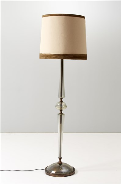 Lampada da terra in vetro soffiato trasparente incolore leggermente iridato, elementi in ottone. Anni '50. (h cm 172) (lievi difetti)