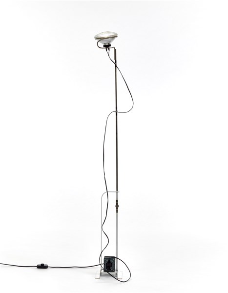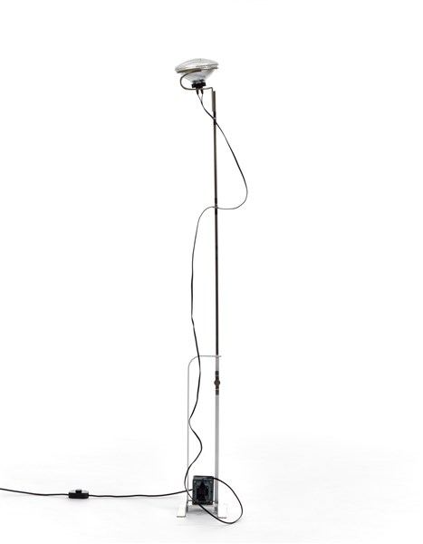 Lampada da terra modello "Toio". Produzione Flos, Milano, 1962. Base in metallo verniciato bianco, fusto in metallo cromato. (altezza regolabile) (lievi difetti)