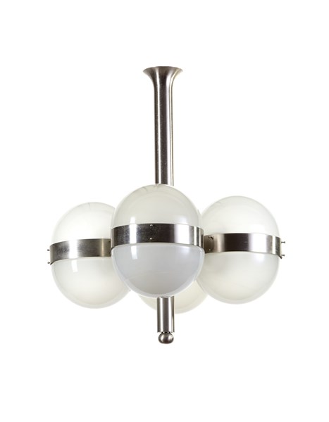 Lampada a sospensione a quattro luci modello "Tetraclio". Produzione Artemide, Milano, 1963. Struttura in metallo nichelato e sfere in vetro acidato internamente. (h cm 78; d cm 66) (difetti)