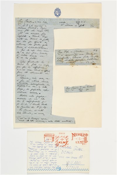 Lot consisting of a circulated postcard and a collage of a letter dated 25.07.1954 handwritten and sent by Gio Ponti to Enrichetta "Chicche" Ritter, editor of the magazine "Domus". New York, 1954. Printed cardboard and blue tissue paper glued on the Domus Editorial's headed paper. (maximum size: 29.7x21 cm) (slight defects)