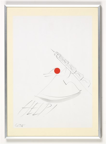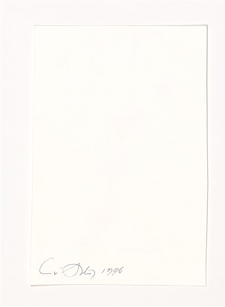 Composizione raffigurante un angelo reggente la Torre Branca di Gio Ponti. Unita a un piccolo biglietto recante un collage con tre fenicotteri rosa. Milano, 1996. Grafite, acquerello e collage su carta; Grafite pennarello rosa, acquerello nero e collage su cartoncino. Firmati rispettivamente in basso a sinistra e al verso in basso a sinistra con data. (cm 29,5x21 e cm 14x9,5)