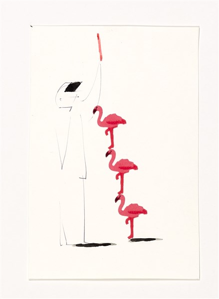 Composition depicting an angel ruling the Torre Branca by Gio Ponti. Combined with a small card with a collage of three pink flamingos. Milan, 1996. Graphite, watercolor and collage on paper; Graphite pink marker, black watercolor and collage on cardboard. Signed lower left and lower left with date respectively. (cm 29.5x21 e cm 14x9.5)