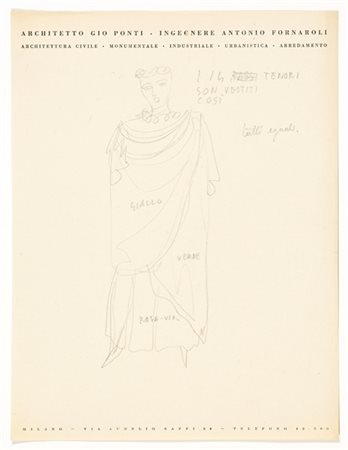 Sketch for the costumes for the opera "Orfeo ed Euridice" by C. W. Gluck. Milan, 1947. Graphite on headed paper "Architect Gio Ponti - Ingegnere Antonio Fornaroli", watermarked paper Regia Ausonia. (27.8x21.6 cm.) (slight defects)