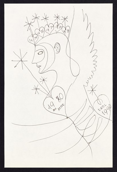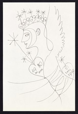 Wishing drawing for the year 1975 depicting an angel crowned with hearts symbolizing the years to come, and which projects the best wishes up to the year 1990. Milan, 1975. Black ink on "Extra strong" watermarked paper. Mounted on black cardboard passparout. (19.9x29.5 cm.)