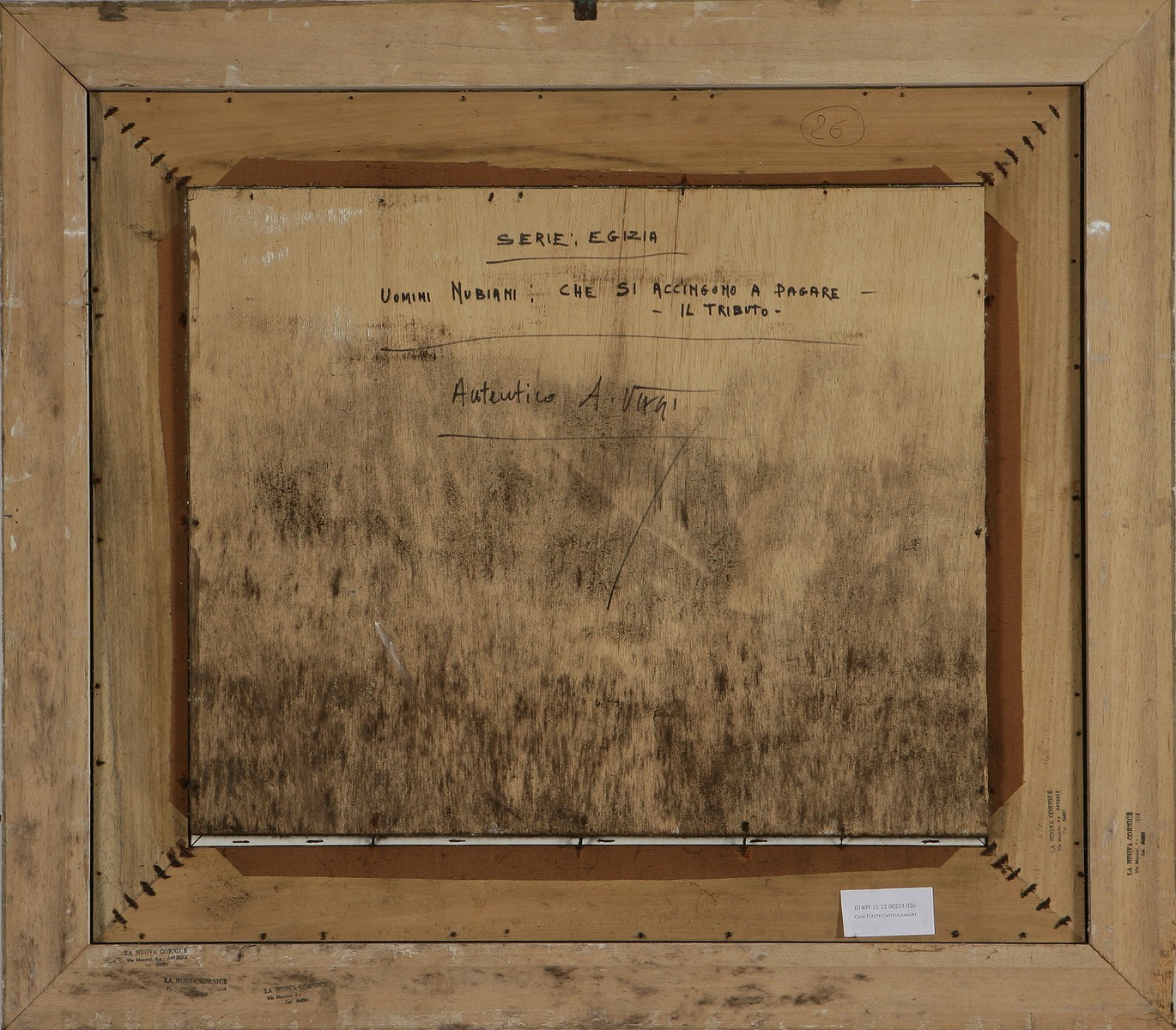 VIRGI A. Uomini nubiani che si accingono a pagare il tributo. 1974. Tempera su tavola. Cm 60,00 x 50,00. Al retro titolo e firma. Firma e data in alto a sinistra. Cornice presente