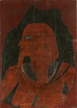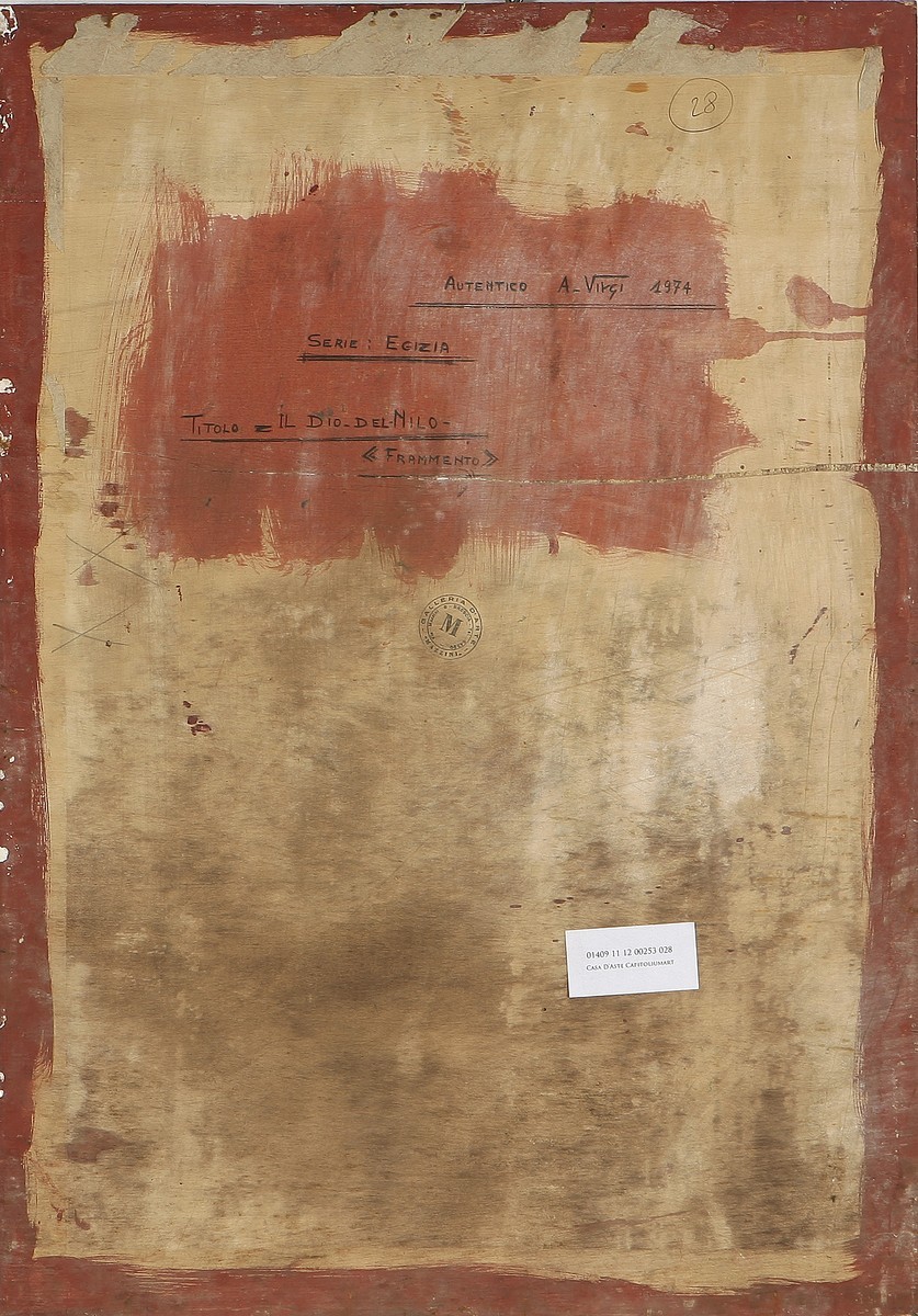 VIRGI A. Dio del Nilo. 1974. Tempera su tavola. Cm 50,00 x 60,00. Al retro firma, titolo, anno e timbro della galleria d'arte Mazzini di Brescia.