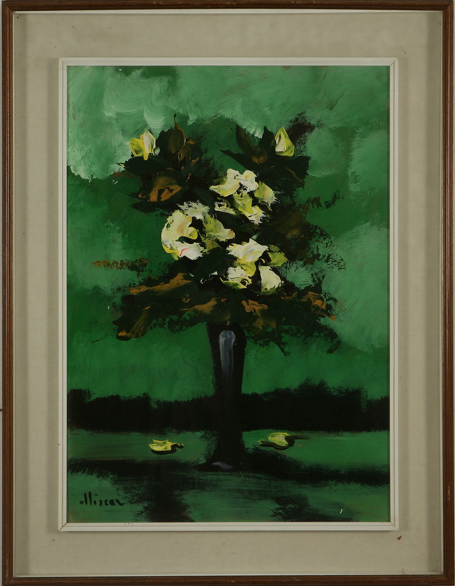ALISCAR Fiori bianchi fondo verde. Olio su tavola. Cm 50,00 x 70,00. Firma in basso a sinistra. Cornice presente