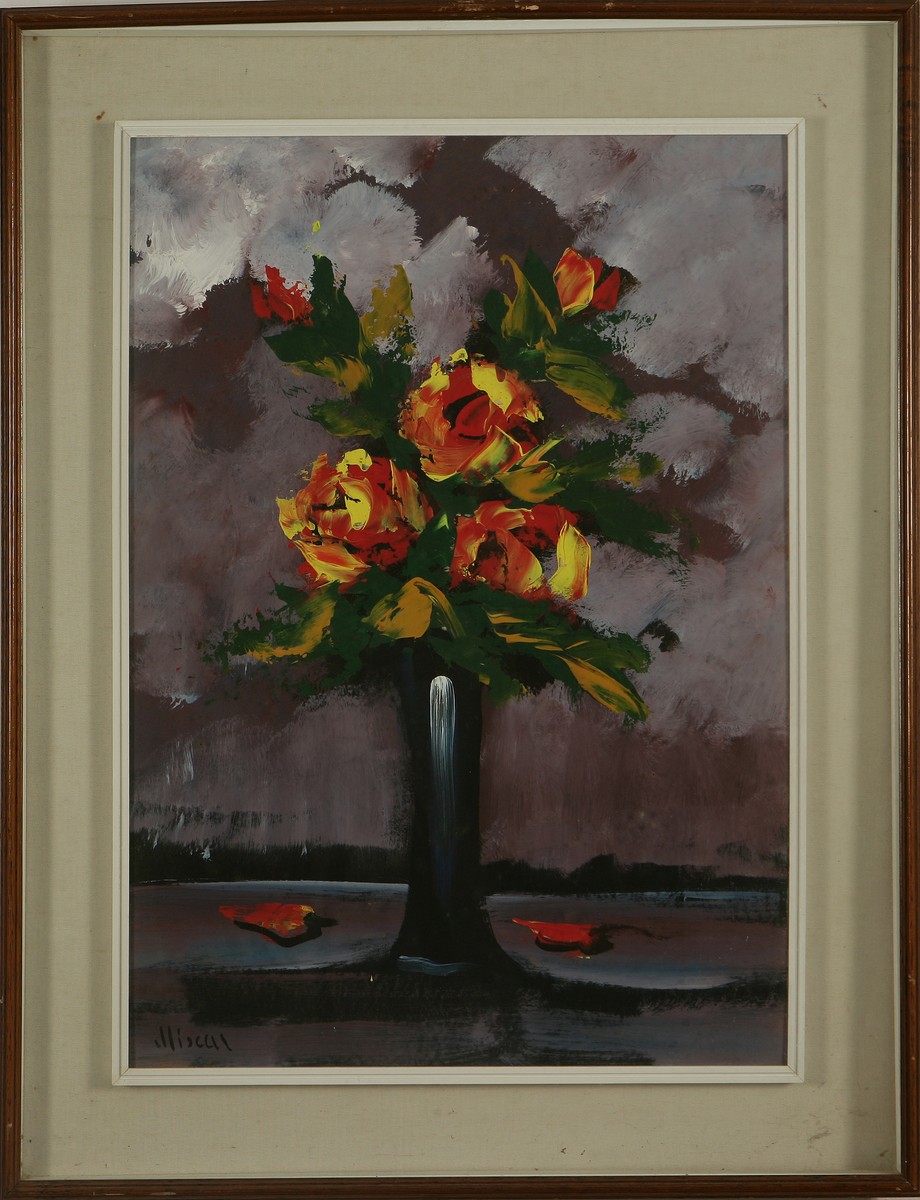 ALISCAR Fiori bianchi fondo viola. Olio su tavola. Cm 50,00 x 70,00. Firma in basso a sinistra. Cornice presente