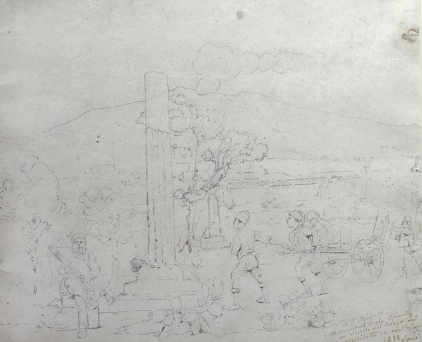 Francesco Paolo Michetti (Tocco di Casauria, 1851 - Francavilla al mare, 1929) SCENA CAMPESTRE TRA RUDERI, 1888 Matita su carta, cm. 26x31 Firma, data e dedica in basso a destra.