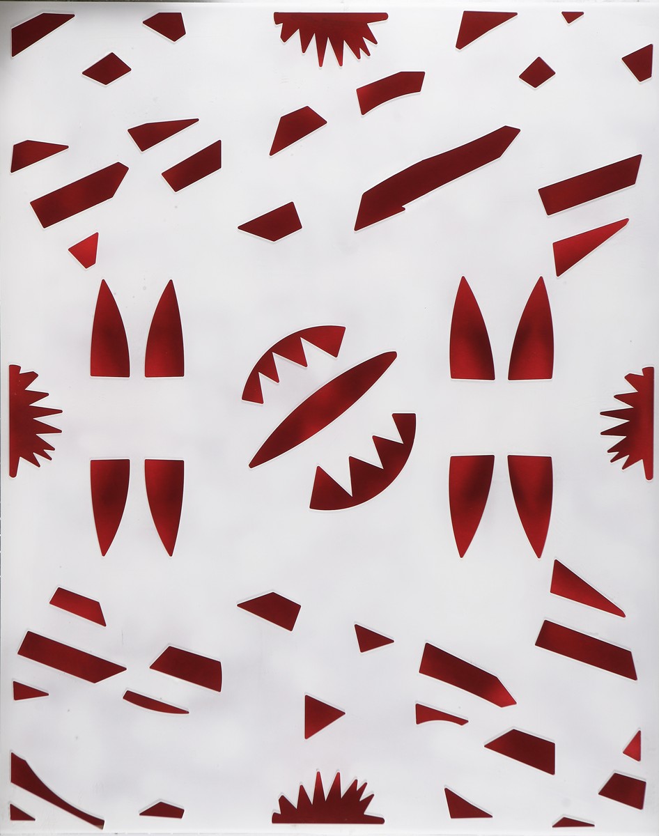 BIANCO REMO (1922 - 1990) Spazio nascosto. 1966. Plexiglass. Cm 100,00 x 80,00. Foglie in plexiglass sagomato su sfondo rosso. Al retro firma e cartiglio descrittivo dell'opera. Autentica su fotografia a cura della sorella dell'artista Lyda Bianchi.