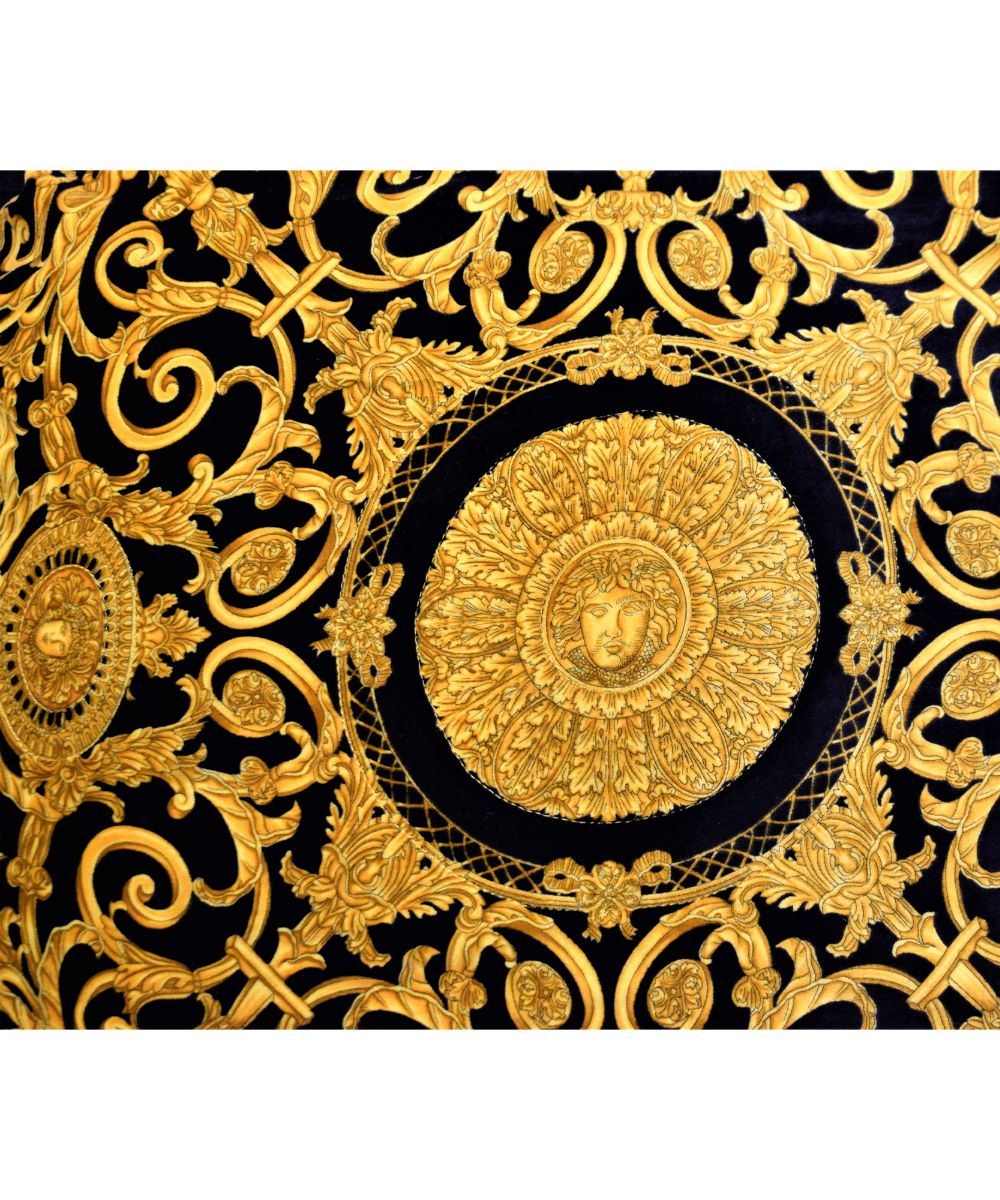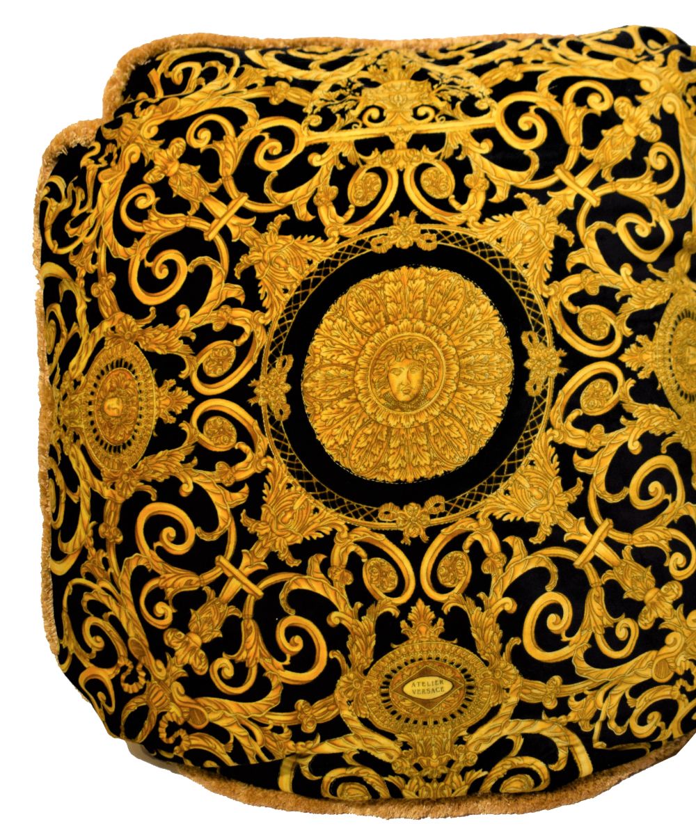 Atelier Versace quattro cuscini in velluto double face decorati a stampa Barocco giallo oro su fondo nero, cm. 72x72 (privi di cerniera e di imbottitura)