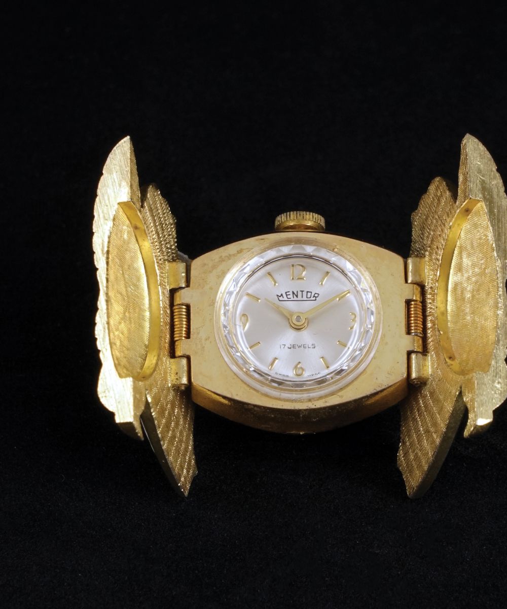 Orologio da signora con cassa in metallo dorato e smalti in forma di una farfalla.