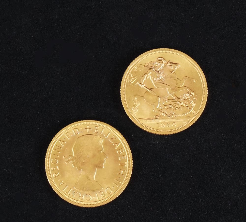Due sterline in oro 18kt. rispettivamente del 1966 e 1967, peso complessivo gr. 15,98