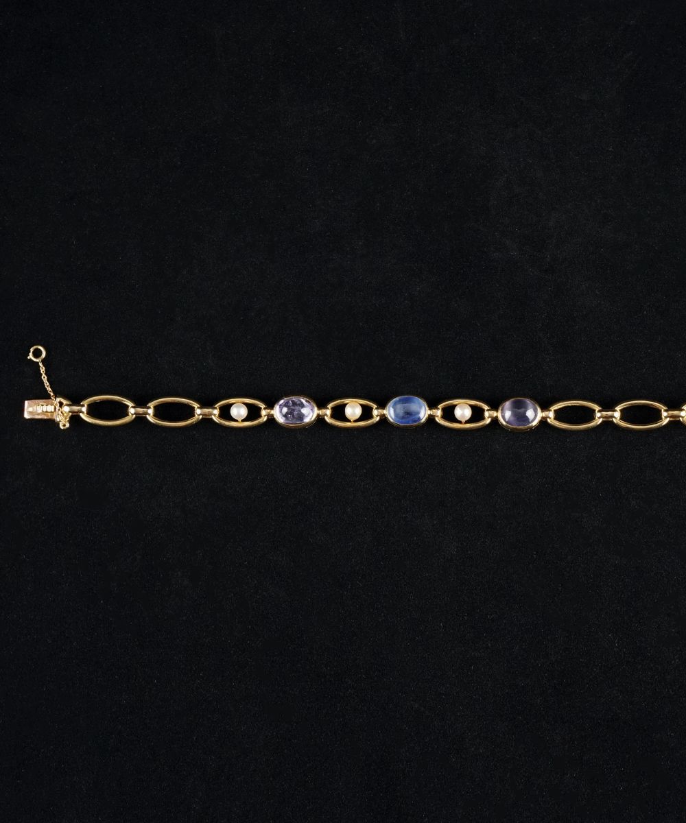 Bracciale in oro giallo 18kt. con tormaline cabochon e perline, l. cm. 19,...