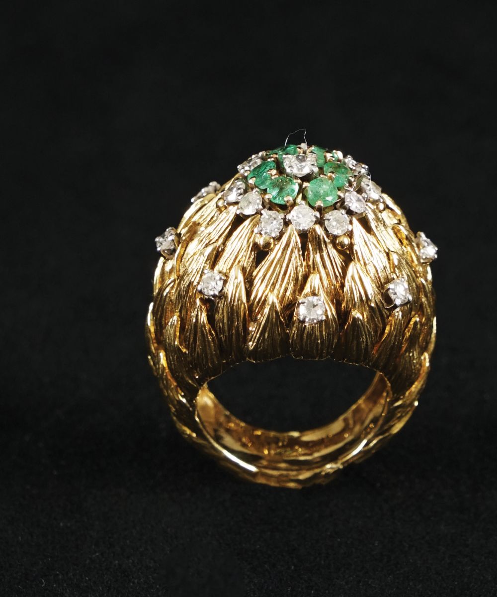 Anello a cupola in oro giallo 18kt. cesellato a foglie con brillanti e smeraldi.