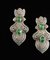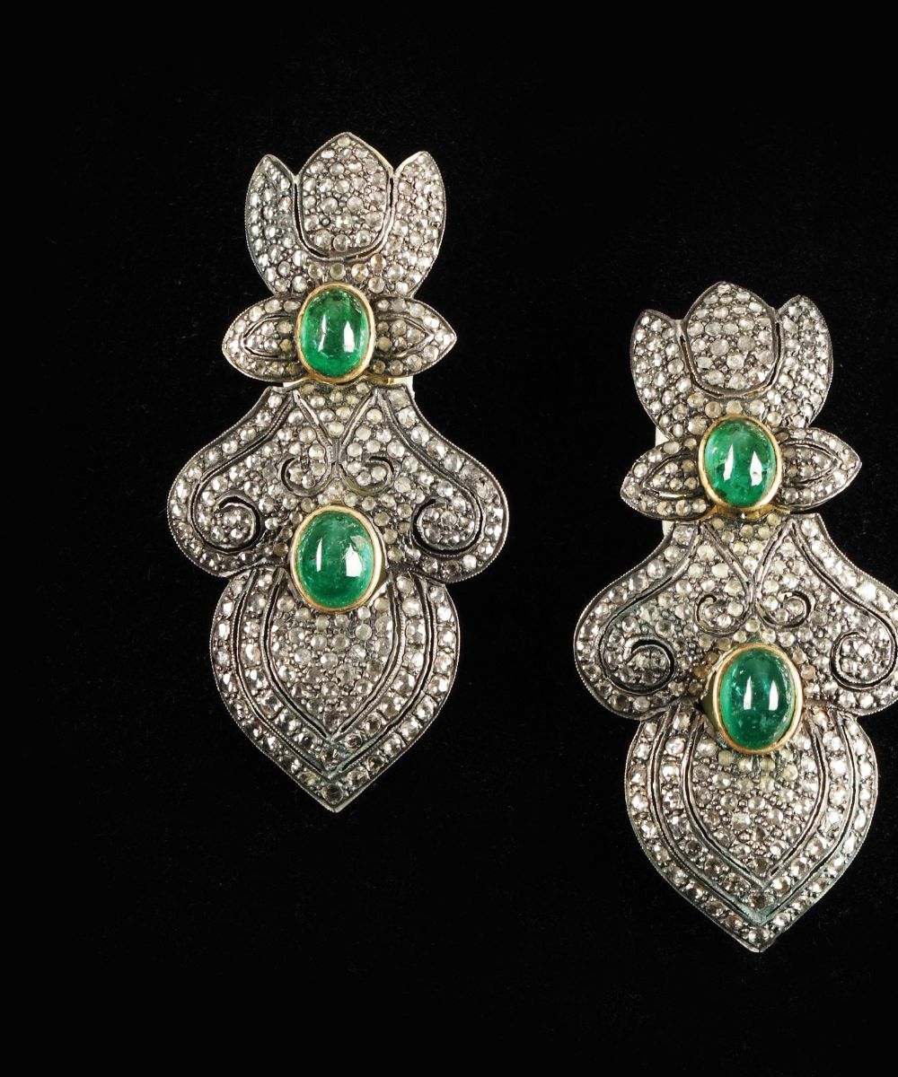 Orecchini pendenti a clip in oro giallo a forma polilobata interamente tempestati di diamanti con quattro smeraldi cabochon ovali, h. cm. 7