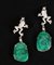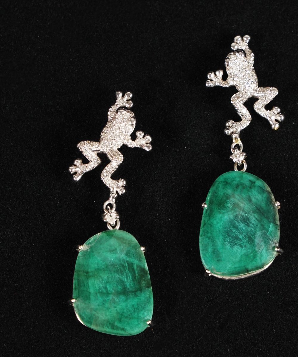 Coppia di orecchini in oro bianco 18kt. cesellati a rana guarnita di brillanti che sorregge un pendente di smeraldo, l. cm. 4,5. Completi di packaging