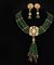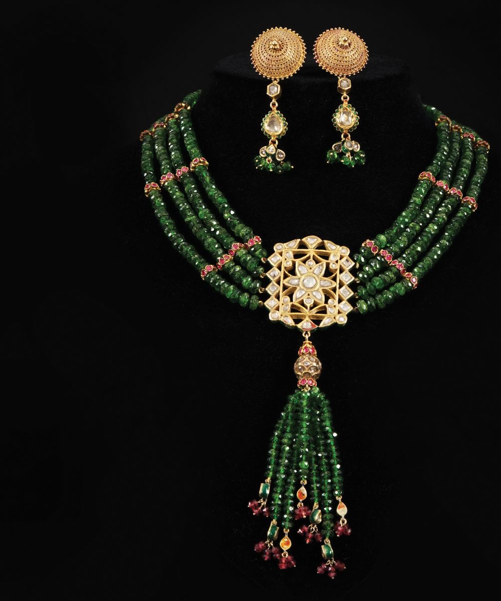 Collana composta da fili di tormaline verdi intervallate da rondelle in oro e rubini con borchia centrale in oro e diamanti con retro decorato a smalti policromi, sfera in oro e diamanti e terminali di diamanti a goccia; orecchini en suite in oro con diamanti e tormaline verdi, la collana l. 40; gli orecchini h. cm. 6,5