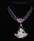 Collana con borchia in oro bianco con rubini, zaffiri cabochon e brillanti da cui pende una scultura in onice e calcedonio con brillanti raffigurante cigni su una base ornata di rubini cabochon e brillanti; il tutto sostenuto da un filo di perle di rubino e due fili di perle di zaffiro, l. cm. 39