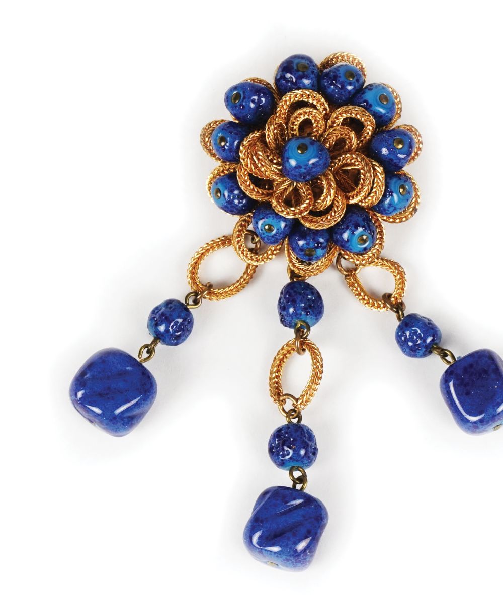 Spilla in metallo dorato con sfere di lapislazzuli. Entro scatola originale.