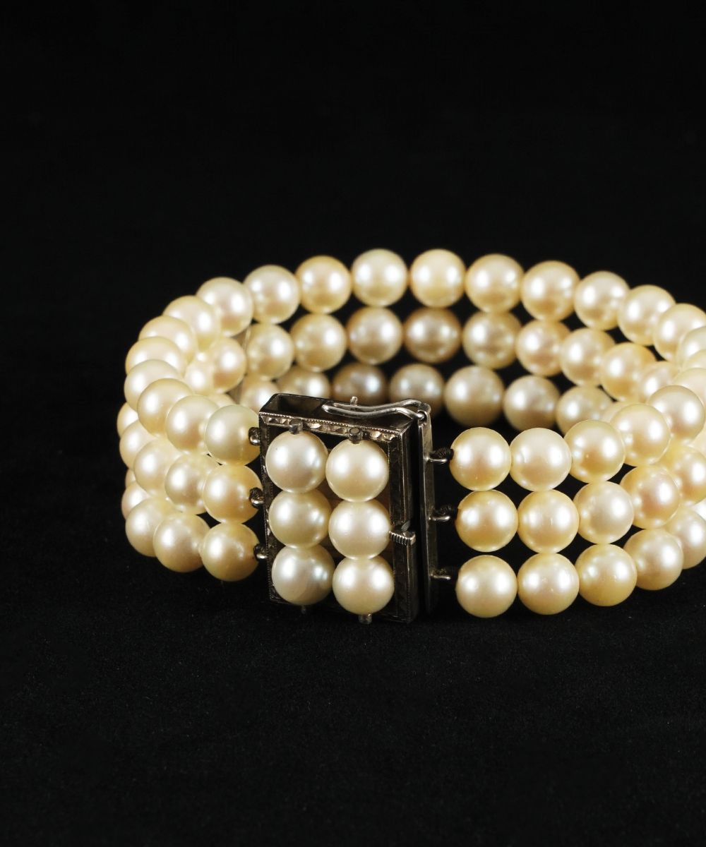 Bracciale a tre fili di perle con montatura in argento sterling, l. cm. 19