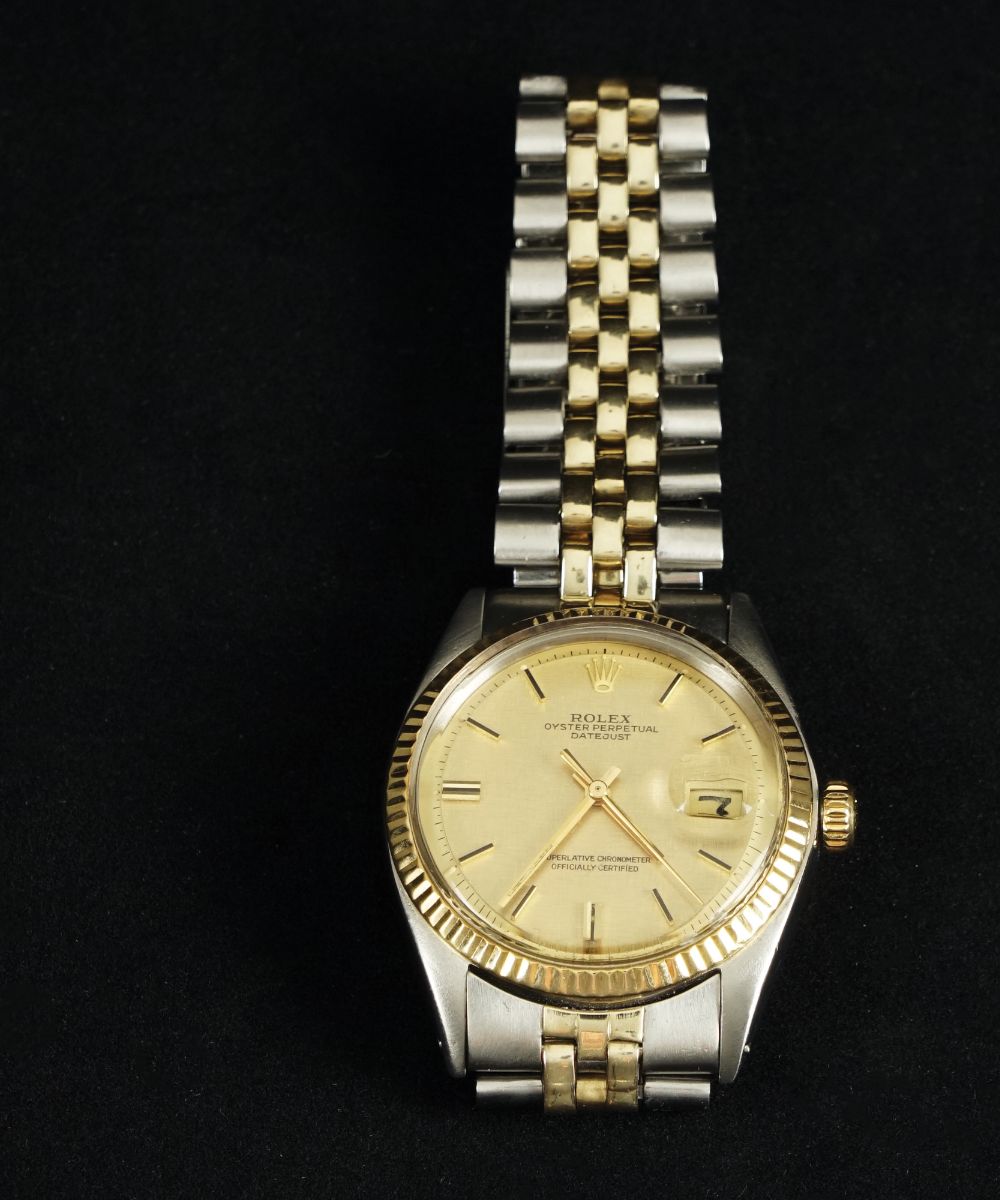 Rolex Datejust ref. 1603. Cassa a tre corpi con raro bracciale jubilee “ovolini” in acciaio e oro giallo 14kt. per il mercato USA. Movimento meccanico a carica automatica con calendario, calibro Rolex 1570. Vetro plexy, quadrante “Linen champagne”. Diametro 36mm., seriale nº 3170xxx del 1972
