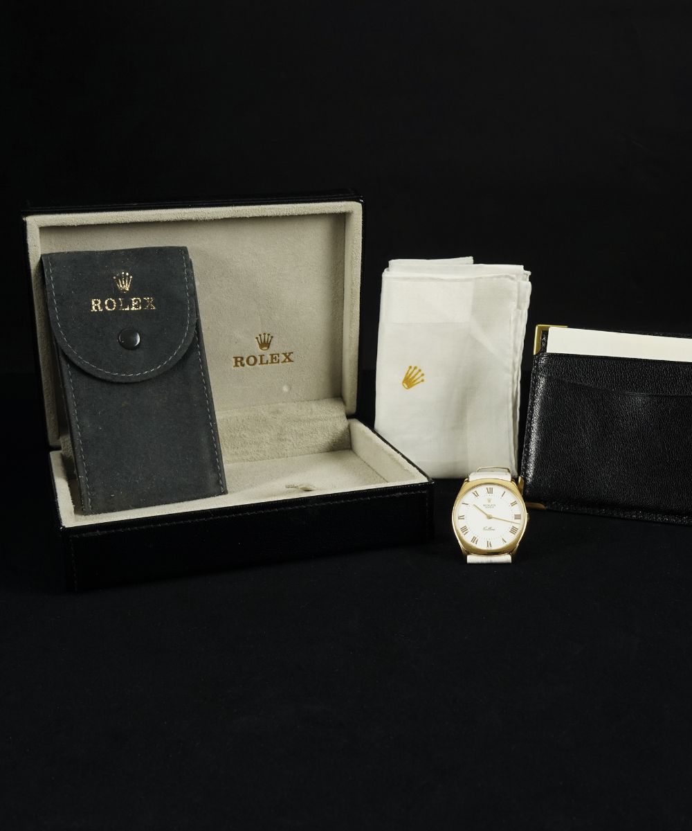 Rolex Cellini con cassa di forma in oro giallo 18kt. da mm. 35; movimento a carica manuale; cinturino in pelle bianca. Scatola, custodia originale e certificato di garanzia, 1993