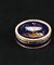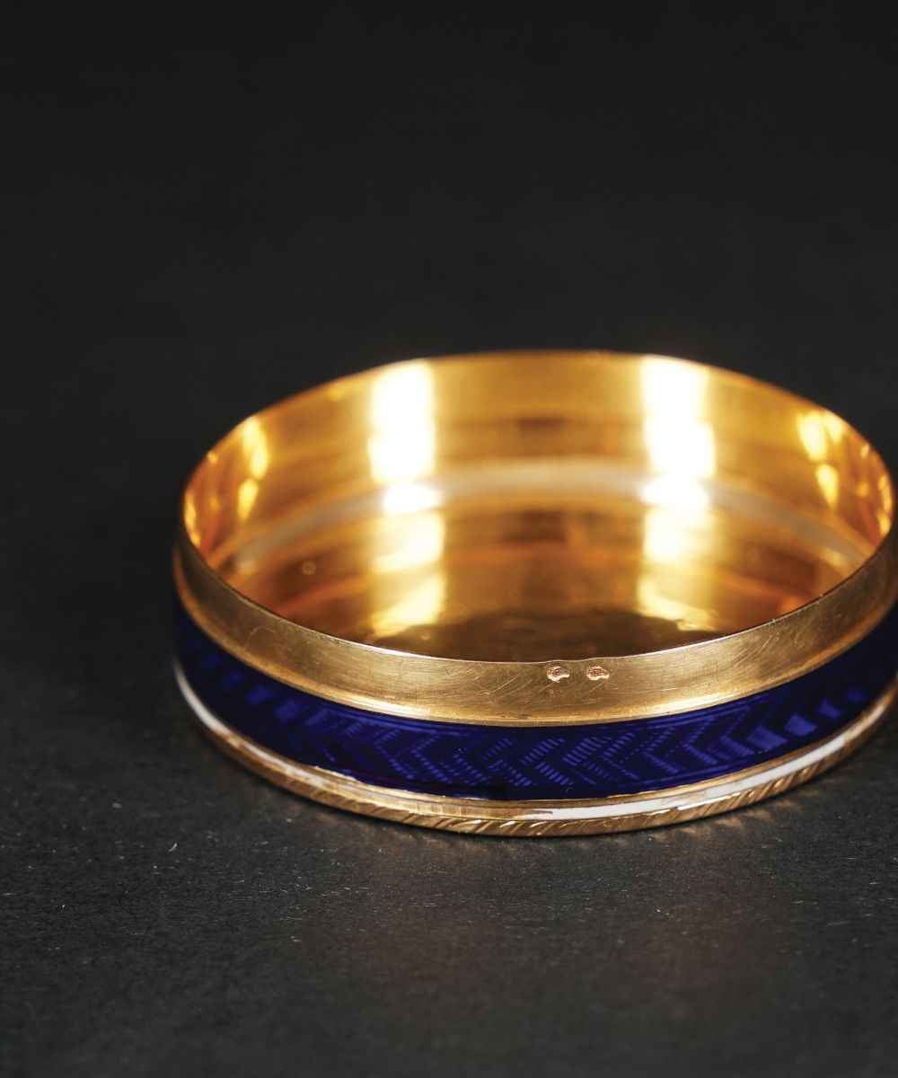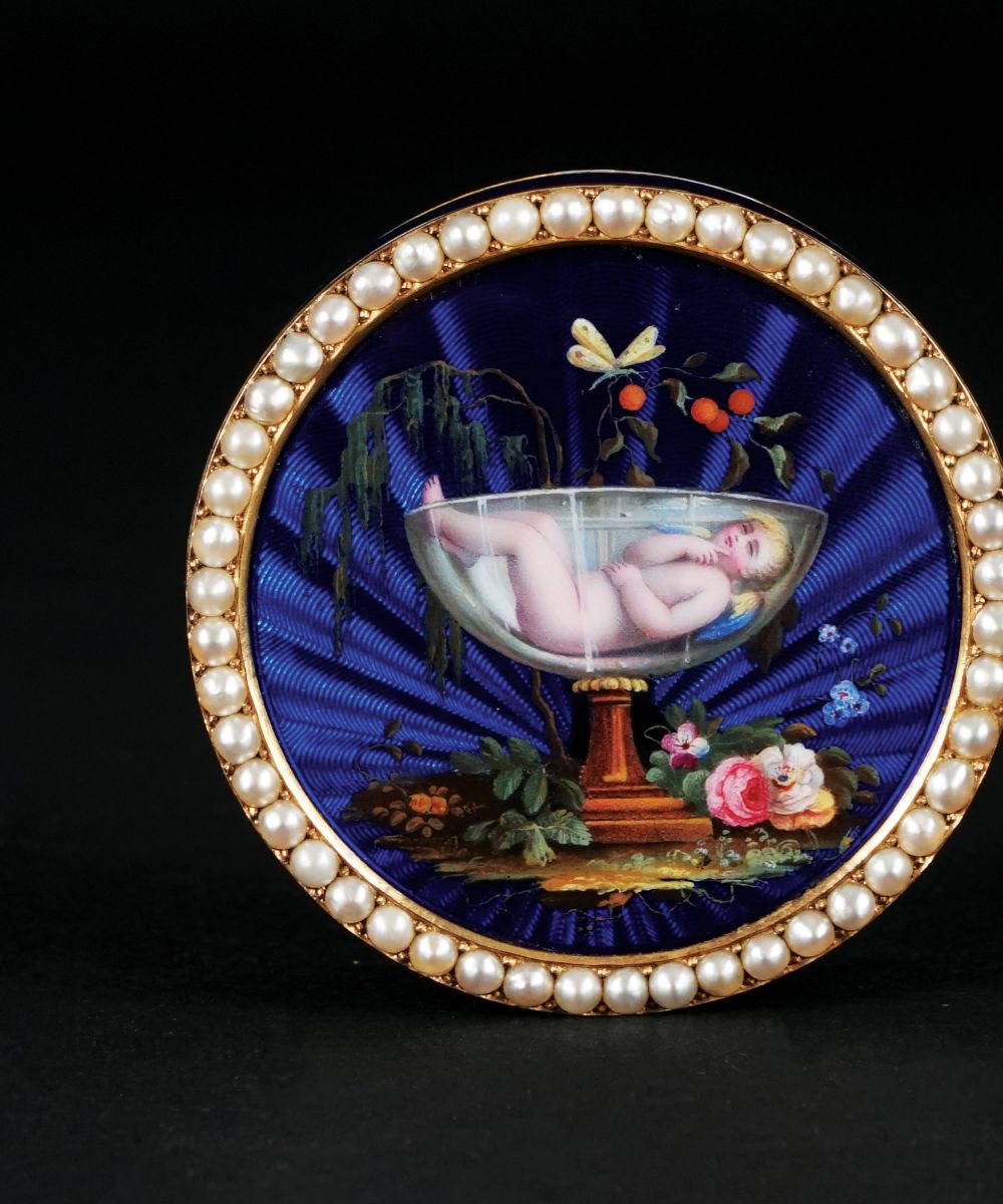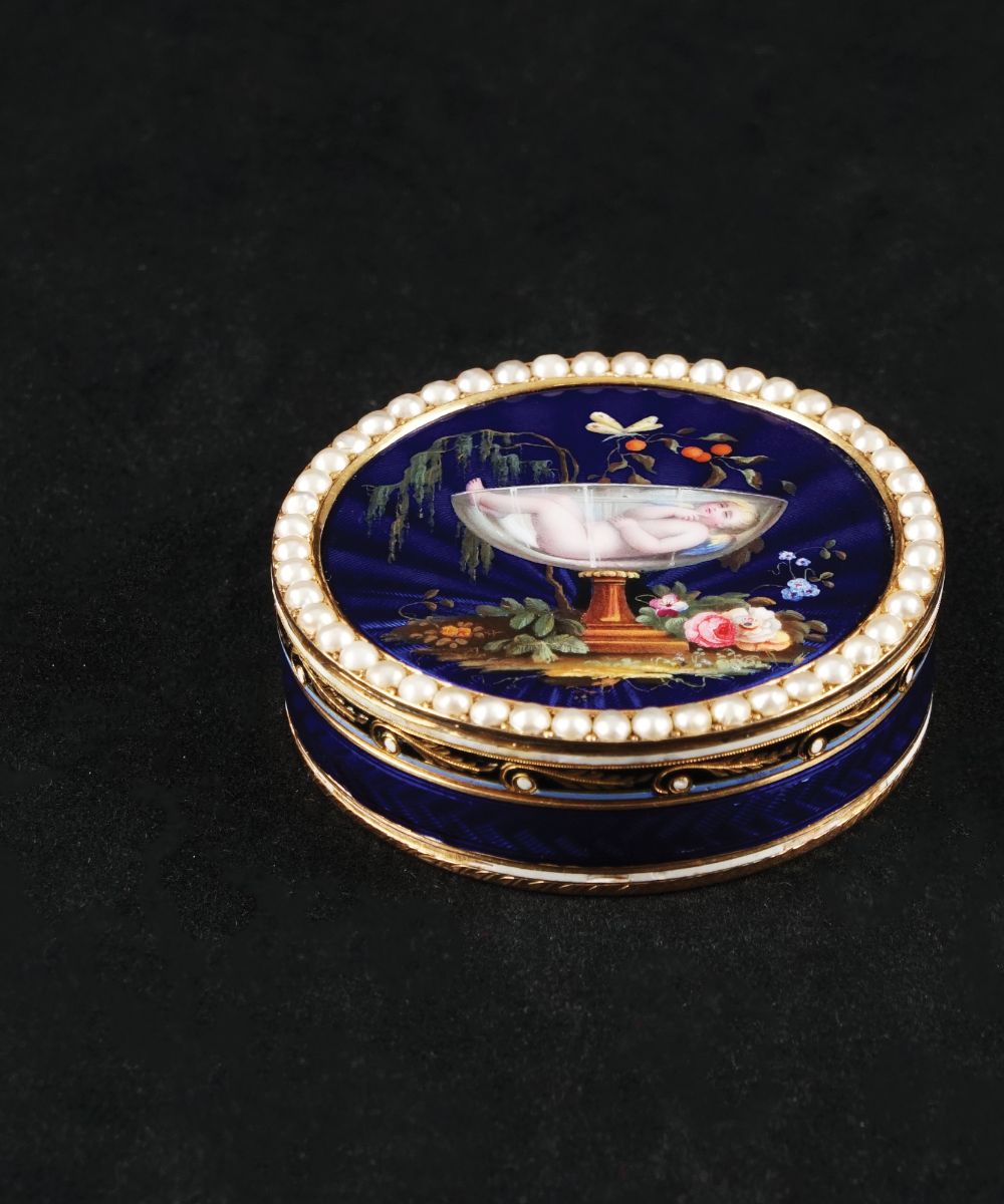 Portanei di forma circolare in oro 18kt. finemente decorato in smalti policromi a fondo blu guilloché a raffigurare un amorino addormentato in una coppa; profilo del coperchio impreziosito da una fascia di microperle. In custodia di pelle verde.