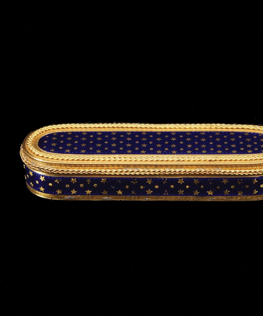 Tabacchiera di forma ovale in oro 18kt., con profili cesellati a cordoncini, rivestita di smalto blu con fondo guilloché decorato a stelle.