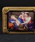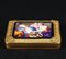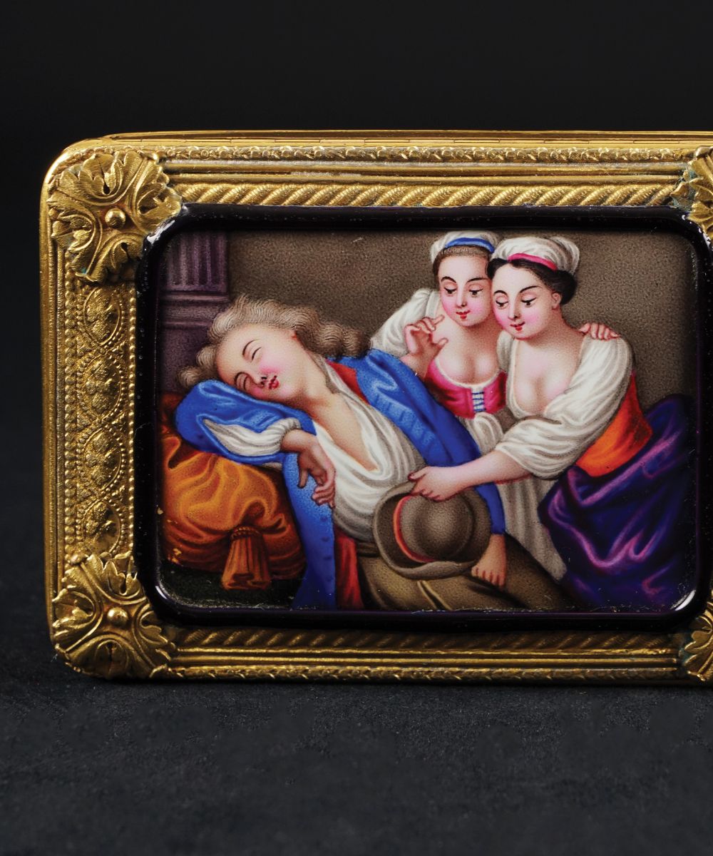 Tabacchiera rettangolare in oro giallo 18kt. con coperchio centrato da una placca di smalti policromi raffiguranti un soggetto galante: agli angoli quattro rosoni fogliati.