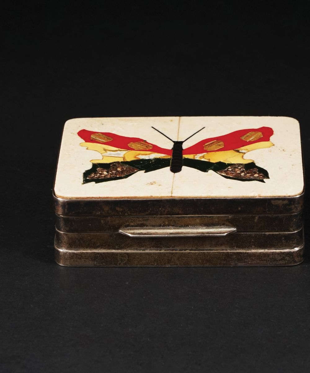 Lotto 119 | Tabacchiera di forma rettangolare in argento; coperchio decorato da una...