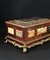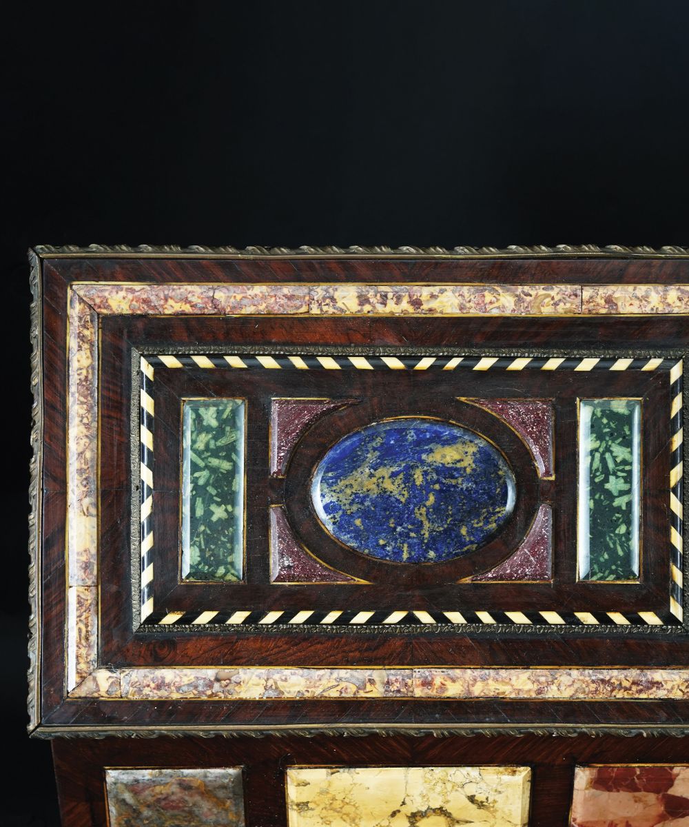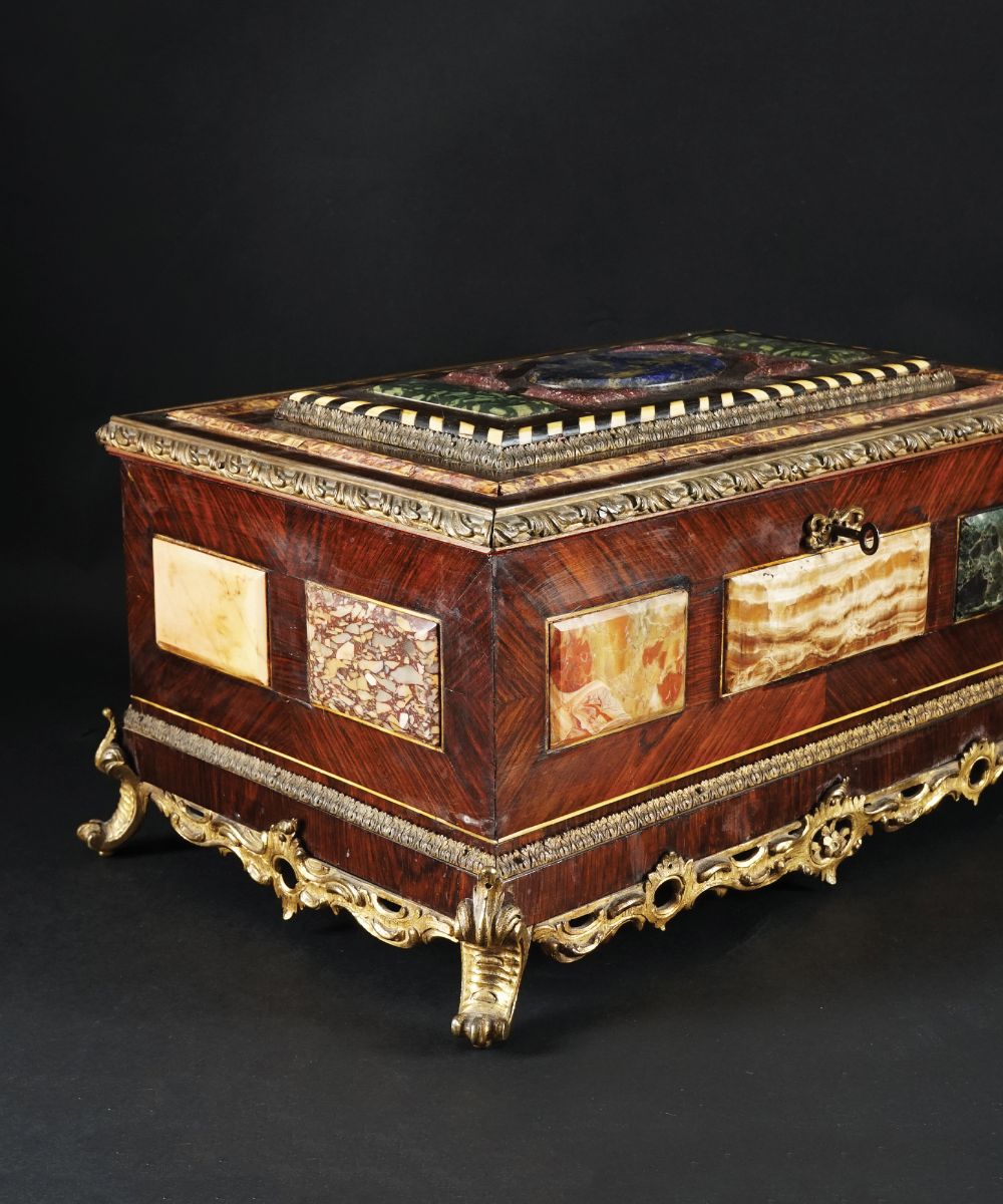 Cofanetto di forma parallelepipeda impiallacciato in palissandro, finemente e riccamente decorato da placche in marmi policromi fra i quali spiccano il porfido, il serpentino verde e il lapislazzuli; montatura di bronzo cesellato e dorato.