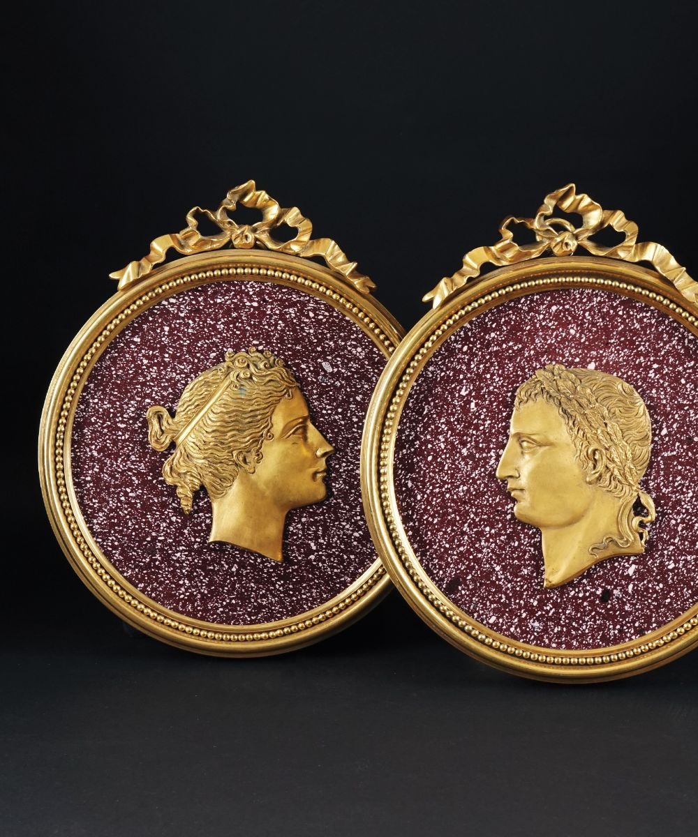 Coppia di medaglioni di forma circolare in porfido centrati rispettivamente da un profilo maschile e femminile in bronzo dorato; montatura parimenti di bronzo dorato.