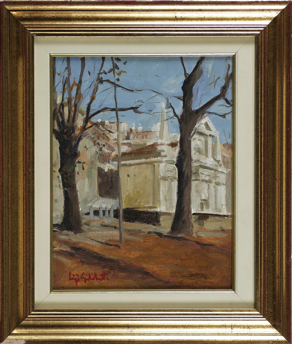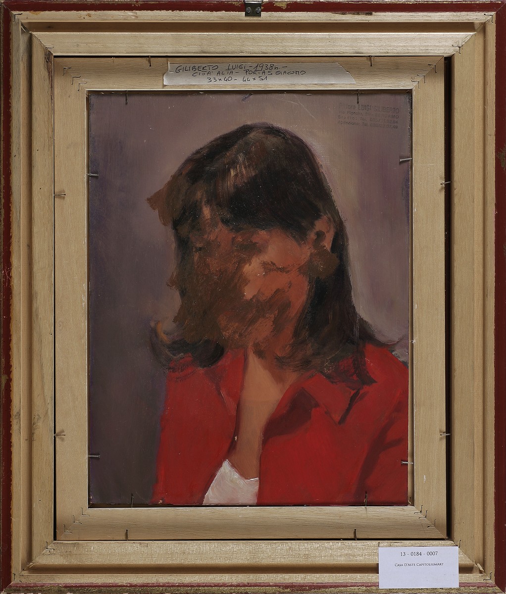 GILBERTO LUIGI (n. 1938) Porta S. Giacomo, Bergamo. Olio su tavola. Cm 33,00 x 40,00. Firma in basso a sinistra. Al retro bozza di ritratto a olio. Cornice presente