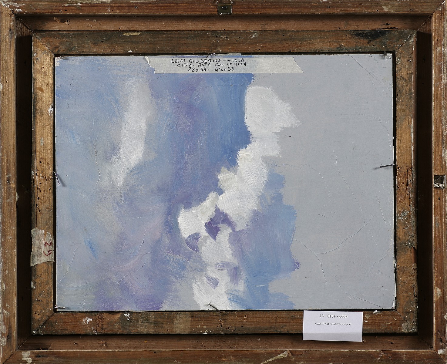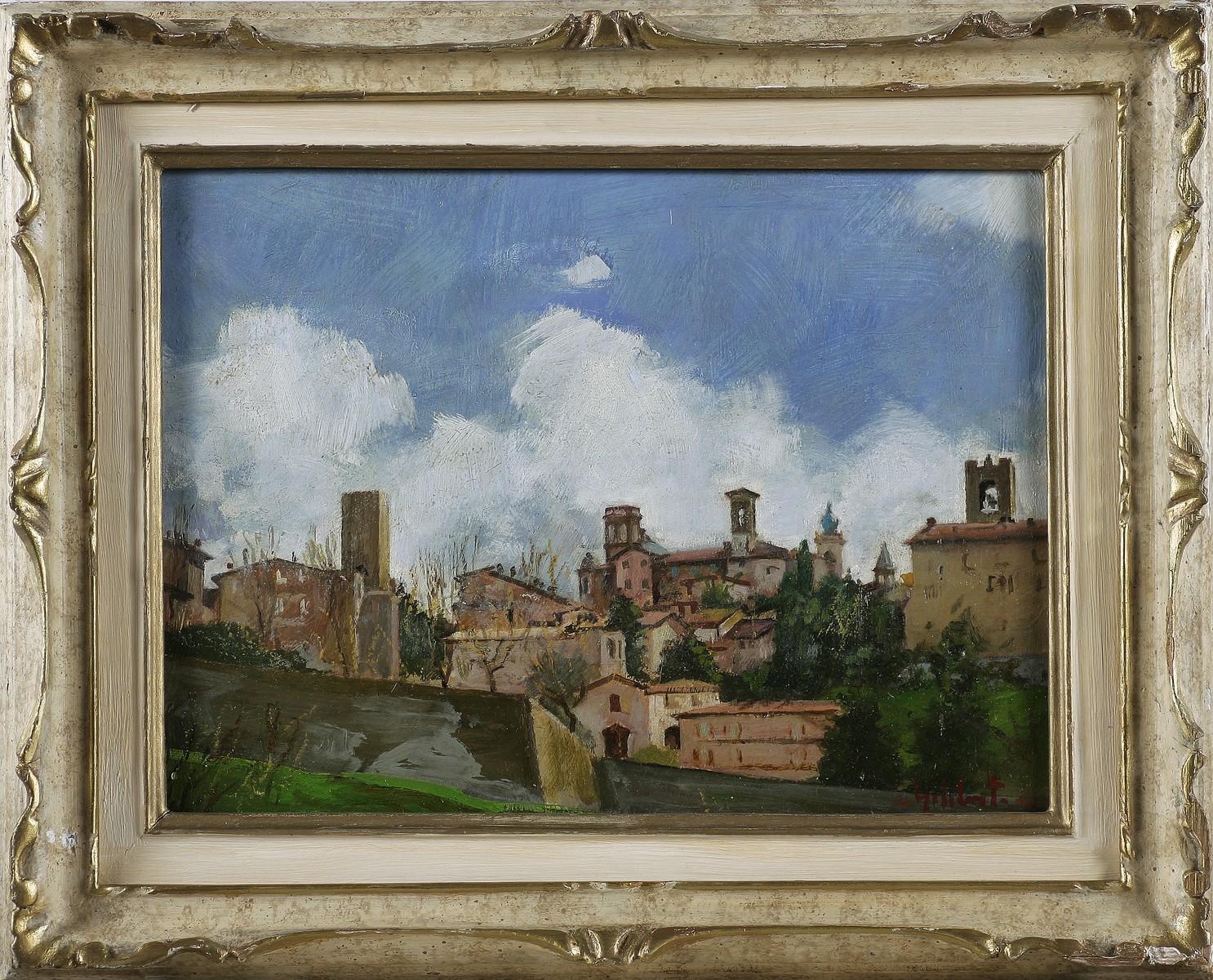 GILBERTO LUIGI (n. 1938) Città alta con le mura. Olio su tavola. Cm 38,00 x 28,00. Firma in basso a destra. Cornice presente