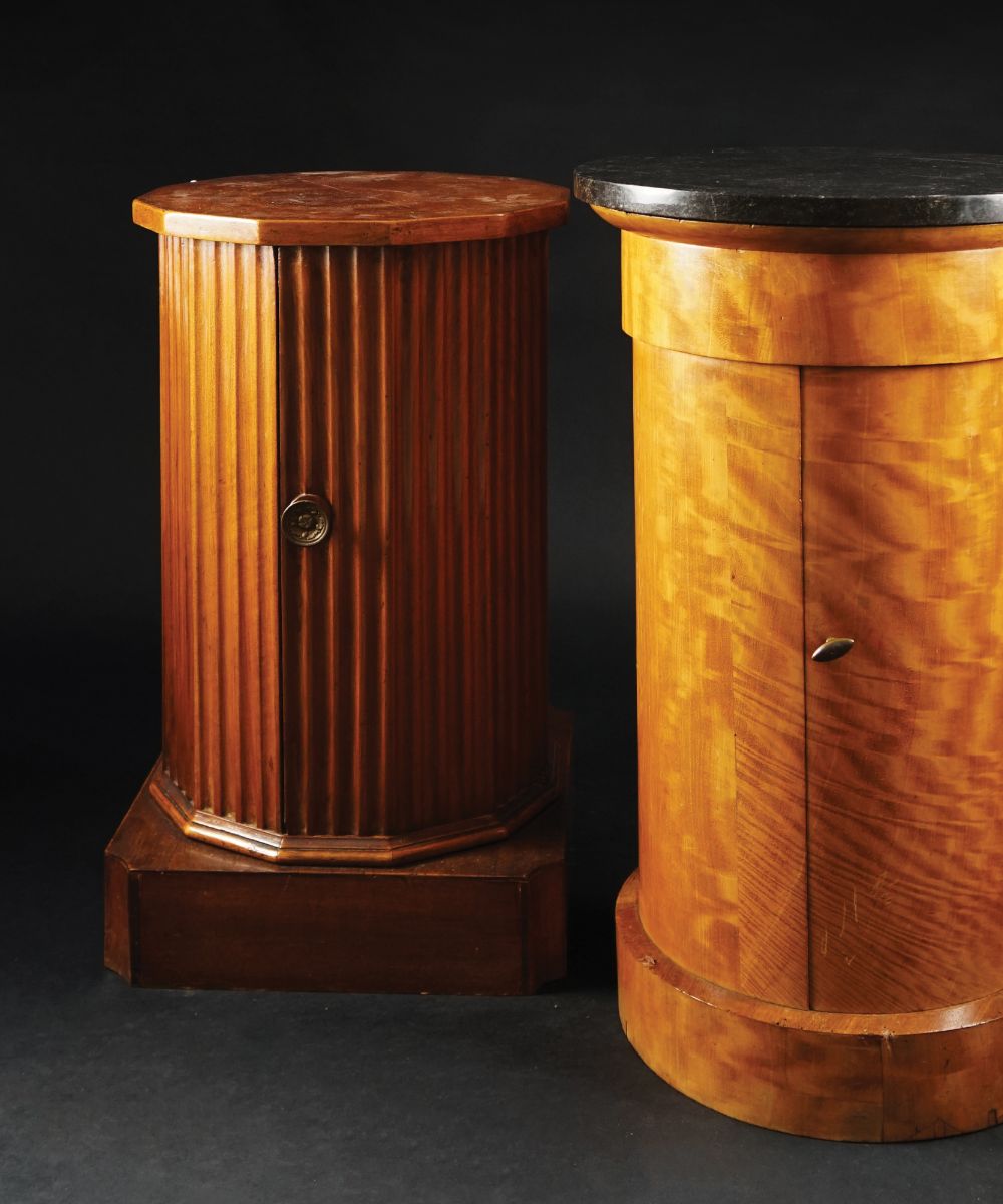Due basi a colonna in mogano e noce: una a fusto liscio con piano di marmo nero, l'altra a sezione dodecagonale scanalata su base quadrata. Ciascuna guarnita di uno sportello.