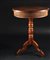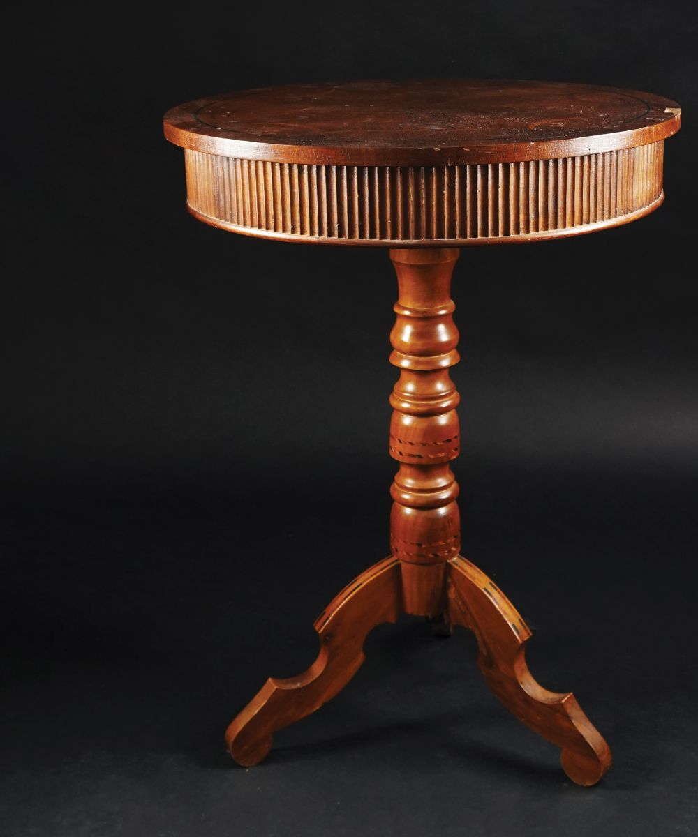 Tavolino in rovere e noce. Piano circolare intarsiato a motivi stilizzati; fascia sottostante scanalata guarnita di un cassetto; sostegno tornito poggiante su tre piedi di linea mossa.
