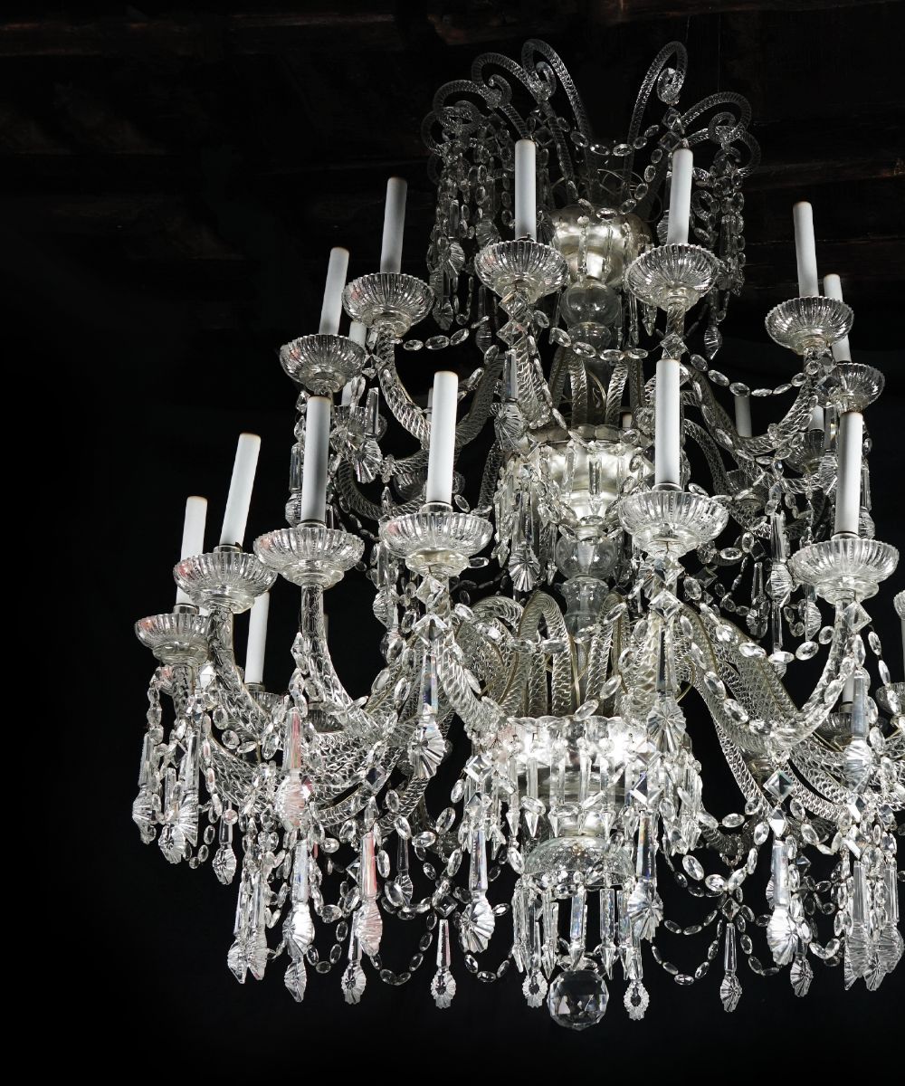 Lampadario a 30 luci in cristallo distribuite su due palchi (12 sul palco superiore e 18 su quello inferiore); altrettanti braccetti portacandela a voluta disposti attorno allo stelo a balaustro e idealmente legati fra loro da catenelle di gocce sfaccettate: una profusione di corolle e prismi pendenti arricchiscono questo straordinario lampadario.