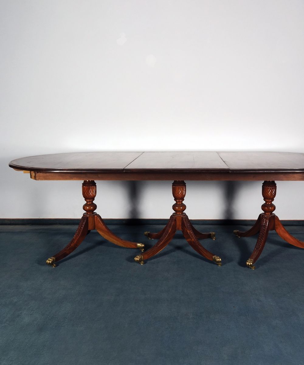 Tavolo di mogano con piano ovale allungabile mediante 6 prolunghe di l. cm. 40 ciascuna; tre sostegni di linea sfuggente con terminali in bronzo dorato.