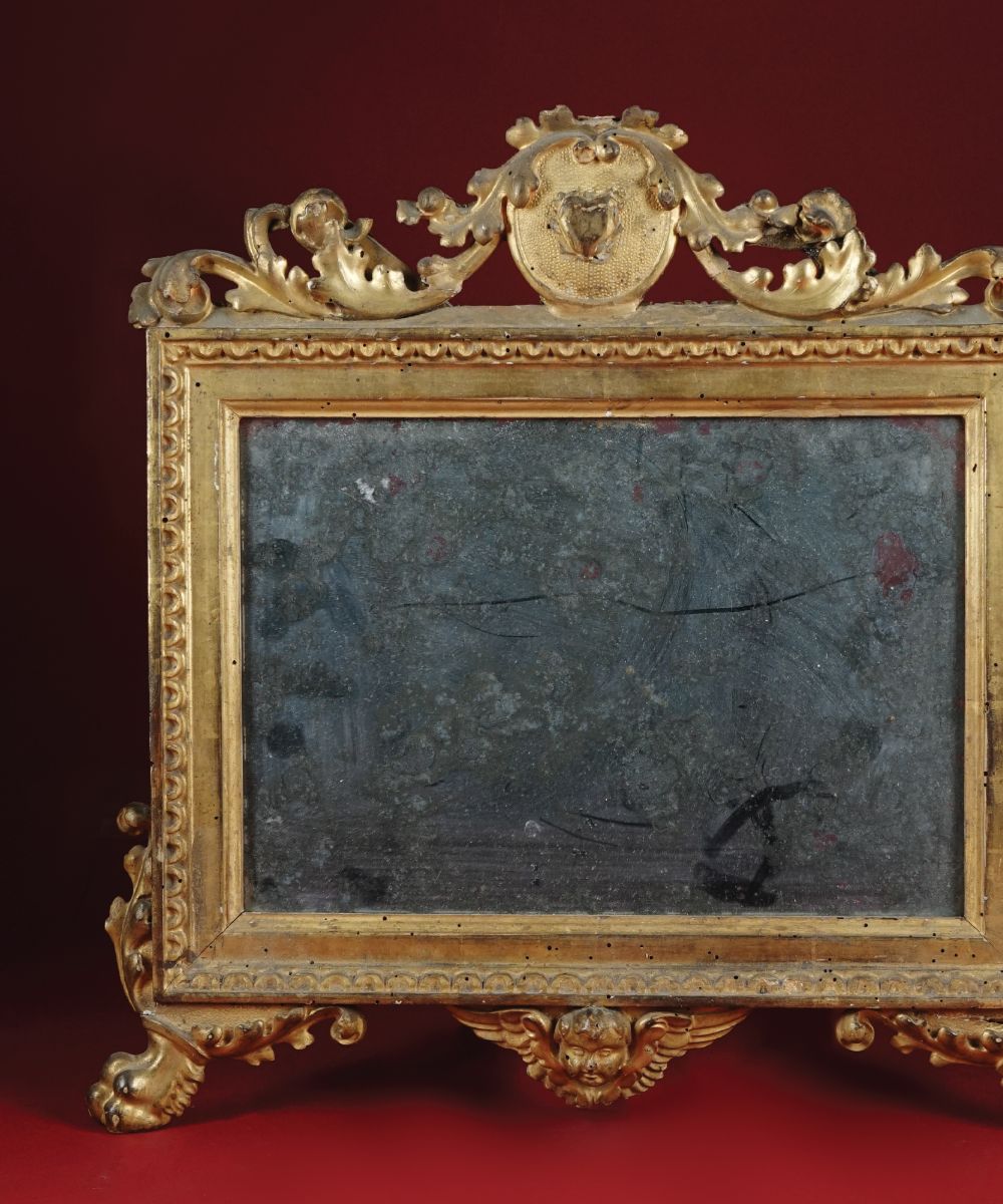 Cartagloria in legno dorato con cimasa scolpita a foglie; due pieducci ferini; luce di specchio.