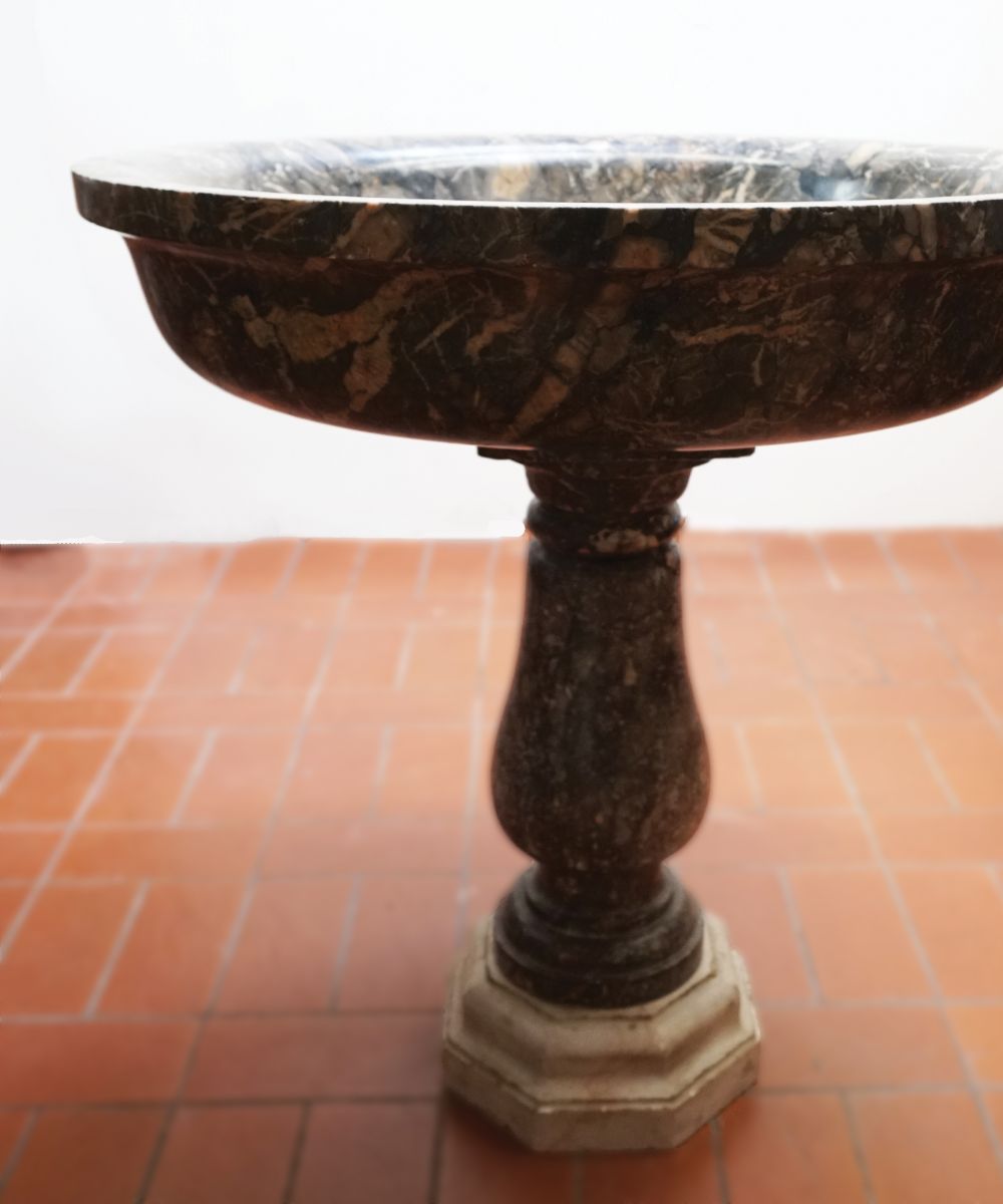Antica vasca in marmo africano su montante tornito; piede ottagonale in marmo...
