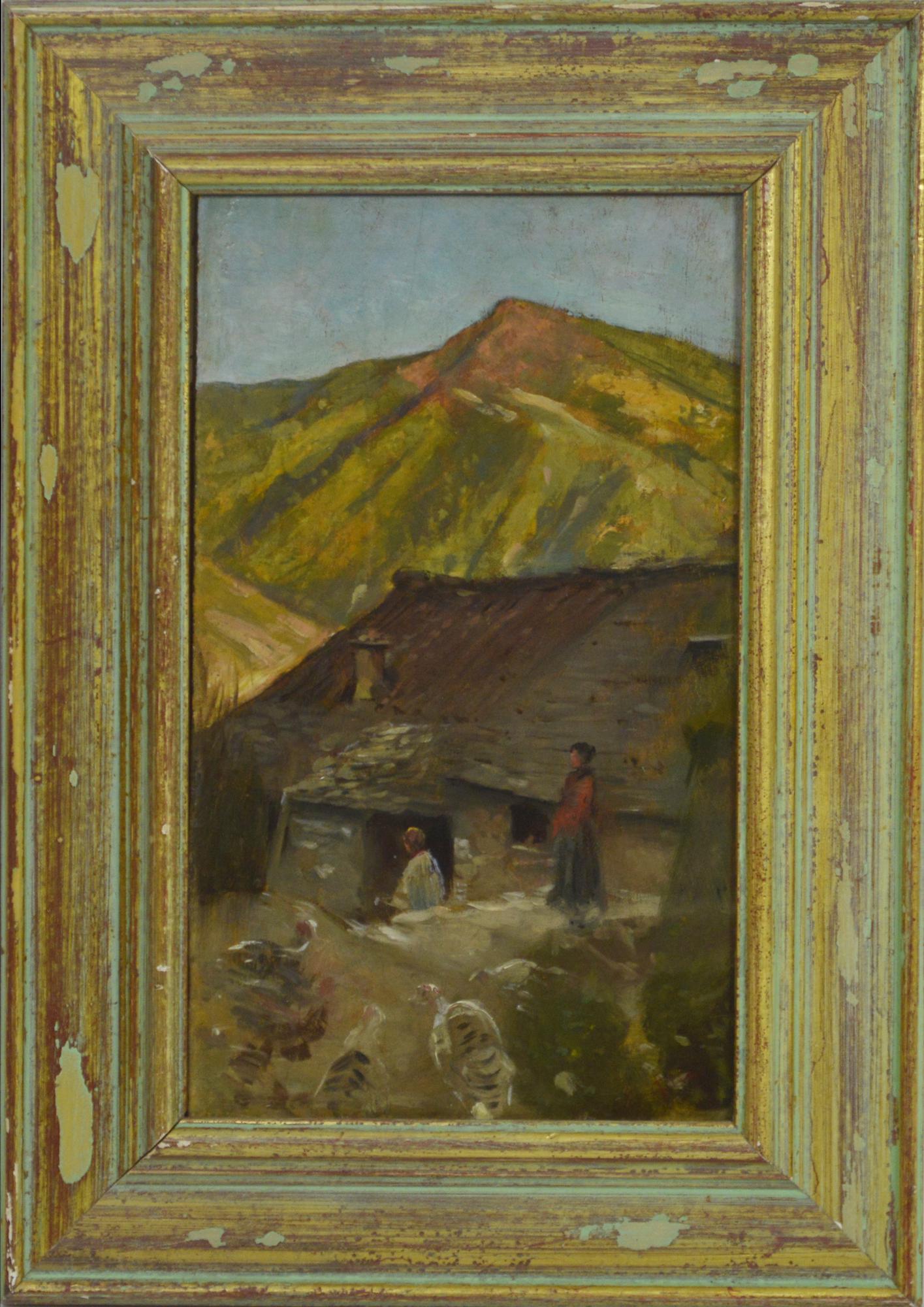 Cesare Ciani (1854 - 1925) CASOLARE CON CONTADINE olio su cartone, cm 32x19,5...